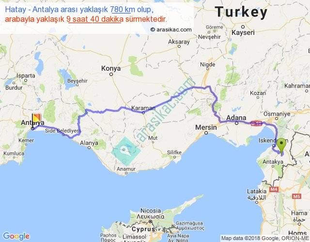 Hatay - Antalya arası yaklaşık olarak 90 km/h ile yukarıda belirtilen sürede olup, iki yerin kuş uçuşu uzaklığı (mesafesi) 503'dir. Eğer belirtilen yerler arasında uçak seferi var ise bu süre uçakla 46 dakika'ya kadar düşebilir. Yolculuk otobüsle 12 saat 34 dakika sürmektedir.