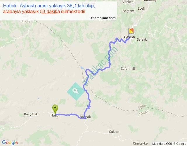 Hatipli - Aybastı arası yaklaşık olarak 90 km/h ile yukarıda belirtilen sürede olup, iki yerin kuş uçuşu uzaklığı (mesafesi) 21'dir. Yolculuk otobüsle 1 saat 8 dakika sürmektedir.
