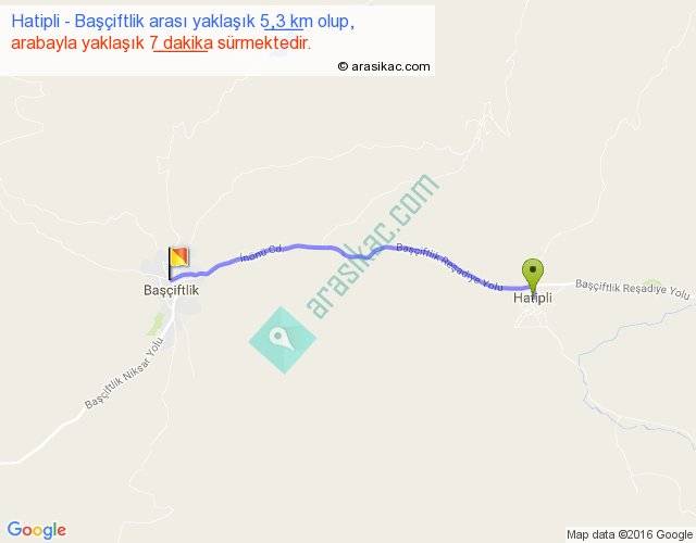 Hatipli - Başçiftlik arası yaklaşık olarak 90 km/h ile yukarıda belirtilen sürede olup, iki yerin kuş uçuşu uzaklığı (mesafesi) 5'dir. Yolculuk otobüsle 9 dakika sürmektedir.