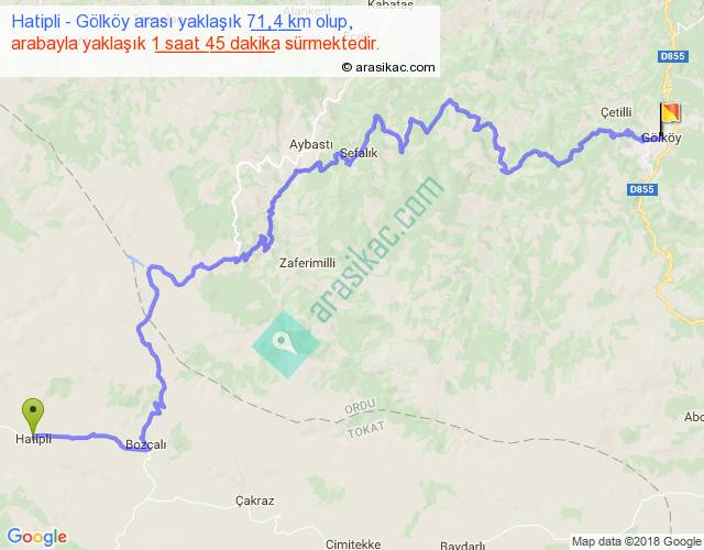 Hatipli - Gölköy arası yaklaşık olarak 90 km/h ile yukarıda belirtilen sürede olup, iki yerin kuş uçuşu uzaklığı (mesafesi) 37'dir. Yolculuk otobüsle 2 saat 16 dakika sürmektedir.