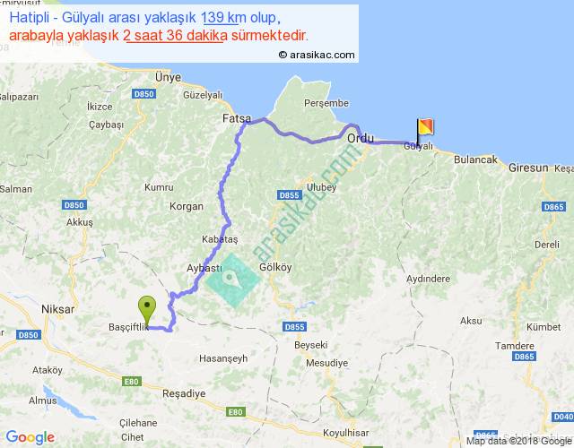 Hatipli - Gülyalı arası yaklaşık olarak 90 km/h ile yukarıda belirtilen sürede olup, iki yerin kuş uçuşu uzaklığı (mesafesi) 84'dir. Yolculuk otobüsle 3 saat 22 dakika sürmektedir.