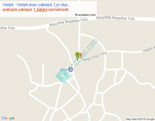 Hatipli - Hatipli arası yaklaşık olarak 90 km/h ile yukarıda belirtilen sürede olup, iki yerin kuş uçuşu uzaklığı (mesafesi) 0'dir. Yolculuk otobüsle 1 dakika sürmektedir.