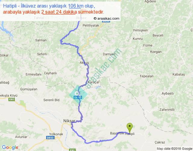 Hatipli - İlküvez arası yaklaşık olarak 90 km/h ile yukarıda belirtilen sürede olup, iki yerin kuş uçuşu uzaklığı (mesafesi) 48'dir. Yolculuk otobüsle 3 saat 7 dakika sürmektedir.