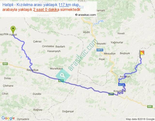 Hatipli - Kızılelma arası yaklaşık olarak 90 km/h ile yukarıda belirtilen sürede olup, iki yerin kuş uçuşu uzaklığı (mesafesi) 62'dir. Yolculuk otobüsle 2 saat 36 dakika sürmektedir.