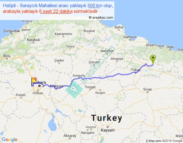 Hatipli - Saraycık Mahallesi arası yaklaşık olarak 90 km/h ile yukarıda belirtilen sürede olup, iki yerin kuş uçuşu uzaklığı (mesafesi) 398'dir. Eğer belirtilen yerler arasında uçak seferi var ise bu süre uçakla 36 dakika'ya kadar düşebilir. Yolculuk otobüsle 8 saat 16 dakika sürmektedir.