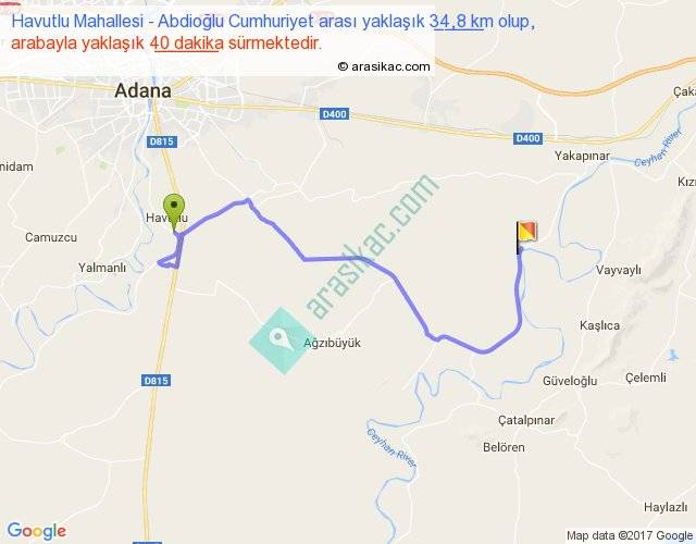 Havutlu Mahallesi - Abdioğlu Cumhuriyet arası yaklaşık olarak 90 km/h ile yukarıda belirtilen sürede olup, iki yerin kuş uçuşu uzaklığı (mesafesi) 19'dir. Yolculuk otobüsle 52 dakika sürmektedir.