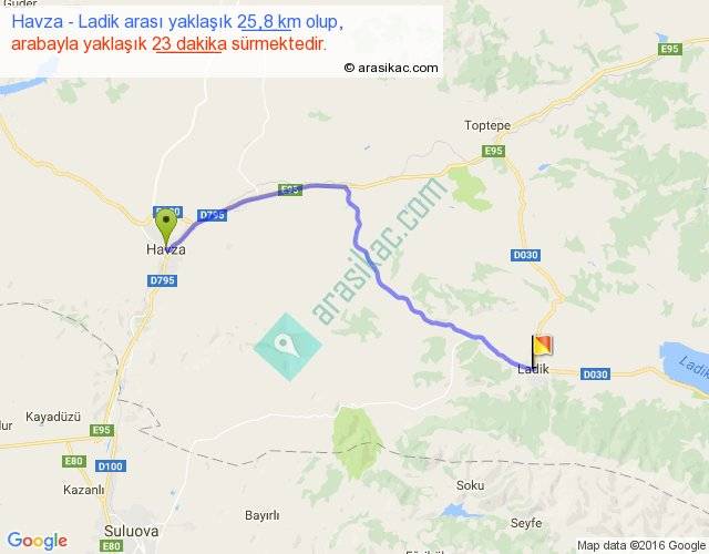 Havza - Ladik arası yaklaşık olarak 90 km/h ile yukarıda belirtilen sürede olup, iki yerin kuş uçuşu uzaklığı (mesafesi) 20'dir. Yolculuk otobüsle 29 dakika sürmektedir.