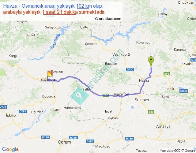 Havza - Osmancık arası yaklaşık olarak 90 km/h ile yukarıda belirtilen sürede olup, iki yerin kuş uçuşu uzaklığı (mesafesi) 78'dir. Yolculuk otobüsle 1 saat 45 dakika sürmektedir.
