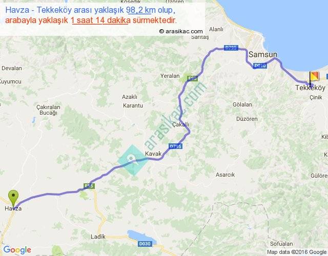 Havza - Tekkeköy arası yaklaşık olarak 90 km/h ile yukarıda belirtilen sürede olup, iki yerin kuş uçuşu uzaklığı (mesafesi) 72'dir. Yolculuk otobüsle 1 saat 36 dakika sürmektedir.