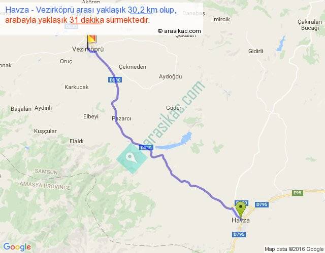 Havza - Vezirköprü arası yaklaşık olarak 90 km/h ile yukarıda belirtilen sürede olup, iki yerin kuş uçuşu uzaklığı (mesafesi) 26'dir. Yolculuk otobüsle 40 dakika sürmektedir.