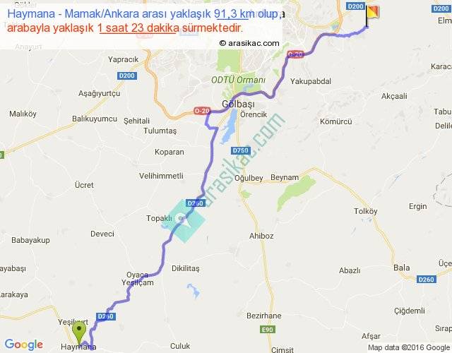 Haymana - Mamak Ankara arası yaklaşık olarak 90 km/h ile yukarıda belirtilen sürede olup, iki yerin kuş uçuşu uzaklığı (mesafesi) 71'dir. Yolculuk otobüsle 1 saat 47 dakika sürmektedir.
