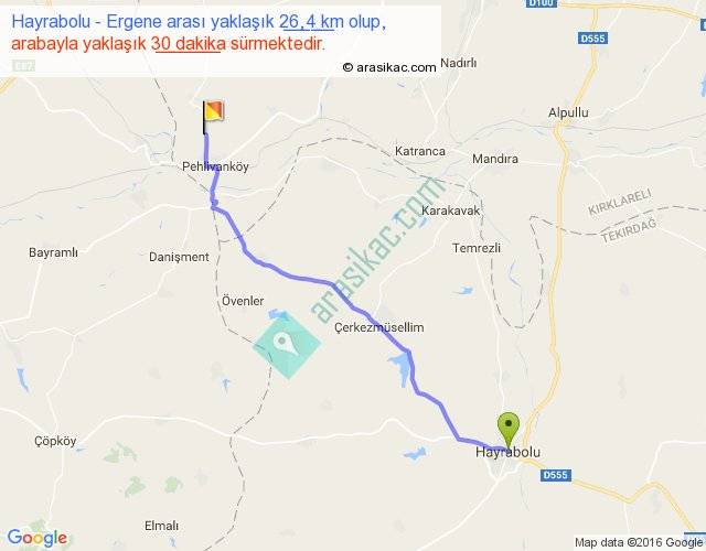 Hayrabolu - Ergene arası yaklaşık olarak 90 km/h ile yukarıda belirtilen sürede olup, iki yerin kuş uçuşu uzaklığı (mesafesi) 23'dir. Yolculuk otobüsle 39 dakika sürmektedir.