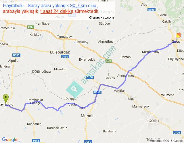 Hayrabolu - Saray arası yaklaşık olarak 90 km/h ile yukarıda belirtilen sürede olup, iki yerin kuş uçuşu uzaklığı (mesafesi) 72'dir. Yolculuk otobüsle 1 saat 46 dakika sürmektedir.