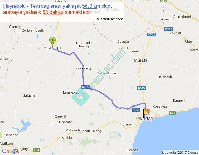 Hayrabolu - Tekirdağ arası yaklaşık olarak 90 km/h ile yukarıda belirtilen sürede olup, iki yerin kuş uçuşu uzaklığı (mesafesi) 43'dir. Yolculuk otobüsle 1 saat 7 dakika sürmektedir.