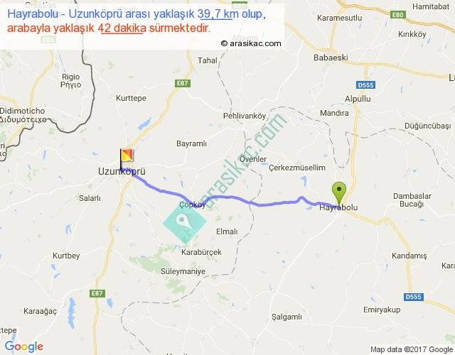 Hayrabolu - Uzunköprü arası yaklaşık olarak 90 km/h ile yukarıda belirtilen sürede olup, iki yerin kuş uçuşu uzaklığı (mesafesi) 35'dir. Yolculuk otobüsle 54 dakika sürmektedir.