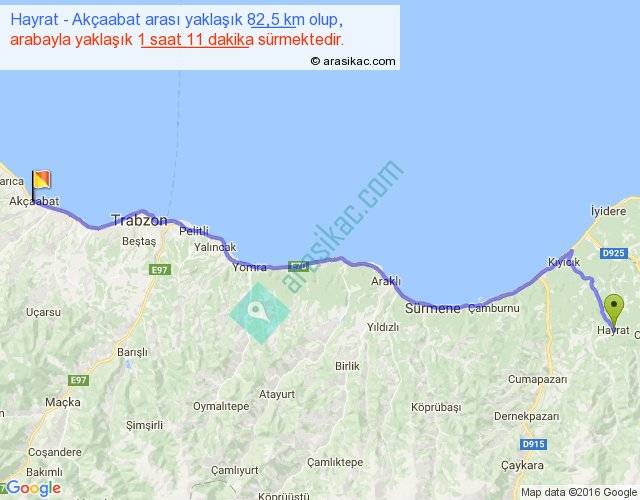 Hayrat - Akçaabat arası yaklaşık olarak 90 km/h ile yukarıda belirtilen sürede olup, iki yerin kuş uçuşu uzaklığı (mesafesi) 68'dir. Yolculuk otobüsle 1 saat 32 dakika sürmektedir.