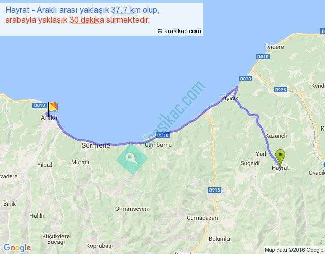 Hayrat - Araklı arası yaklaşık olarak 90 km/h ile yukarıda belirtilen sürede olup, iki yerin kuş uçuşu uzaklığı (mesafesi) 27'dir. Yolculuk otobüsle 39 dakika sürmektedir.