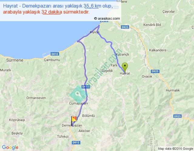 Hayrat - Dernekpazarı arası yaklaşık olarak 90 km/h ile yukarıda belirtilen sürede olup, iki yerin kuş uçuşu uzaklığı (mesafesi) 14'dir. Yolculuk otobüsle 41 dakika sürmektedir.