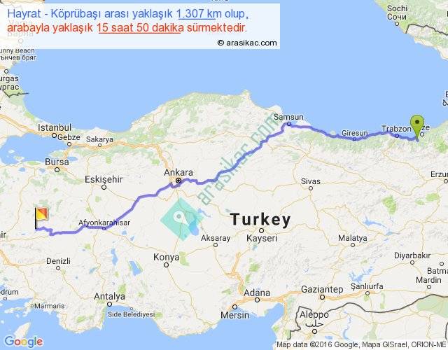Hayrat - Köprübaşı arası yaklaşık olarak 90 km/h ile yukarıda belirtilen sürede olup, iki yerin kuş uçuşu uzaklığı (mesafesi) 1042'dir. Eğer belirtilen yerler arasında uçak seferi var ise bu süre uçakla 1 saat 36 dakika'ya kadar düşebilir. Yolculuk otobüsle 20 saat 35 dakika sürmektedir.