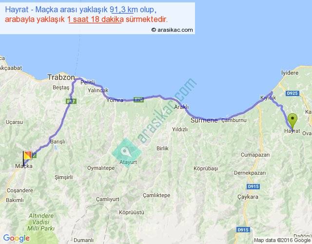 Hayrat - Maçka arası yaklaşık olarak 90 km/h ile yukarıda belirtilen sürede olup, iki yerin kuş uçuşu uzaklığı (mesafesi) 64'dir. Yolculuk otobüsle 1 saat 41 dakika sürmektedir.