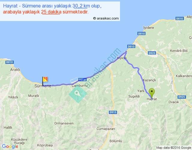 Hayrat - Sürmene arası yaklaşık olarak 90 km/h ile yukarıda belirtilen sürede olup, iki yerin kuş uçuşu uzaklığı (mesafesi) 21'dir. Yolculuk otobüsle 32 dakika sürmektedir.