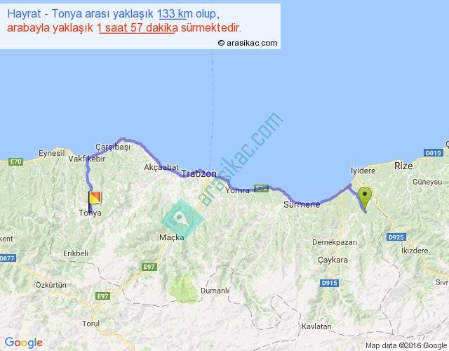 Hayrat - Tonya arası yaklaşık olarak 90 km/h ile yukarıda belirtilen sürede olup, iki yerin kuş uçuşu uzaklığı (mesafesi) 90'dir. Yolculuk otobüsle 2 saat 32 dakika sürmektedir.