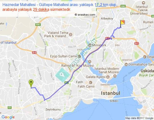 Haznedar Mahallesi - Gültepe Mahallesi arası yaklaşık olarak 90 km/h ile yukarıda belirtilen sürede olup, iki yerin kuş uçuşu uzaklığı (mesafesi) 13'dir. Yolculuk otobüsle 37 dakika sürmektedir.