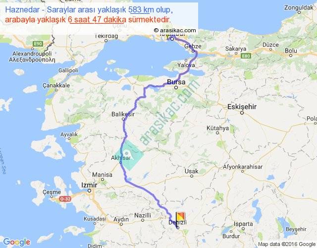 Haznedar - Saraylar arası yaklaşık olarak 90 km/h ile yukarıda belirtilen sürede olup, iki yerin kuş uçuşu uzaklığı (mesafesi) 357'dir. Eğer belirtilen yerler arasında uçak seferi var ise bu süre uçakla 32 dakika'ya kadar düşebilir. Yolculuk otobüsle 8 saat 49 dakika sürmektedir.
