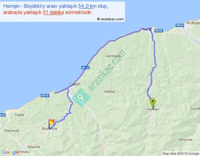 Hemşin - Büyükköy arası yaklaşık olarak 90 km/h ile yukarıda belirtilen sürede olup, iki yerin kuş uçuşu uzaklığı (mesafesi) 19'dir. Yolculuk otobüsle 1 saat 6 dakika sürmektedir.