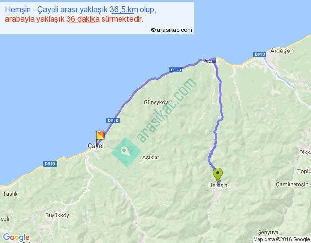 Hemşin - Çayeli arası yaklaşık olarak 90 km/h ile yukarıda belirtilen sürede olup, iki yerin kuş uçuşu uzaklığı (mesafesi) 15'dir. Yolculuk otobüsle 46 dakika sürmektedir.