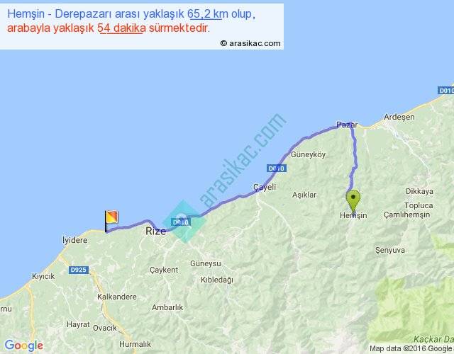 Hemşin - Derepazarı arası yaklaşık olarak 90 km/h ile yukarıda belirtilen sürede olup, iki yerin kuş uçuşu uzaklığı (mesafesi) 40'dir. Yolculuk otobüsle 1 saat 10 dakika sürmektedir.