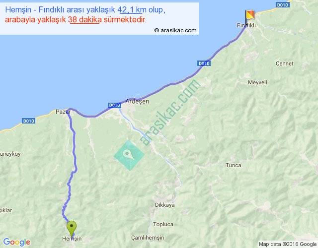 Hemşin - Fındıklı arası yaklaşık olarak 90 km/h ile yukarıda belirtilen sürede olup, iki yerin kuş uçuşu uzaklığı (mesafesi) 32'dir. Yolculuk otobüsle 49 dakika sürmektedir.