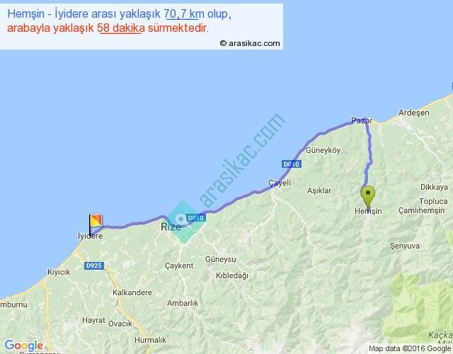 Hemşin - İyidere arası yaklaşık olarak 90 km/h ile yukarıda belirtilen sürede olup, iki yerin kuş uçuşu uzaklığı (mesafesi) 45'dir. Yolculuk otobüsle 1 saat 15 dakika sürmektedir.