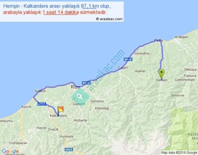 Hemşin - Kalkandere arası yaklaşık olarak 90 km/h ile yukarıda belirtilen sürede olup, iki yerin kuş uçuşu uzaklığı (mesafesi) 40'dir. Yolculuk otobüsle 1 saat 36 dakika sürmektedir.