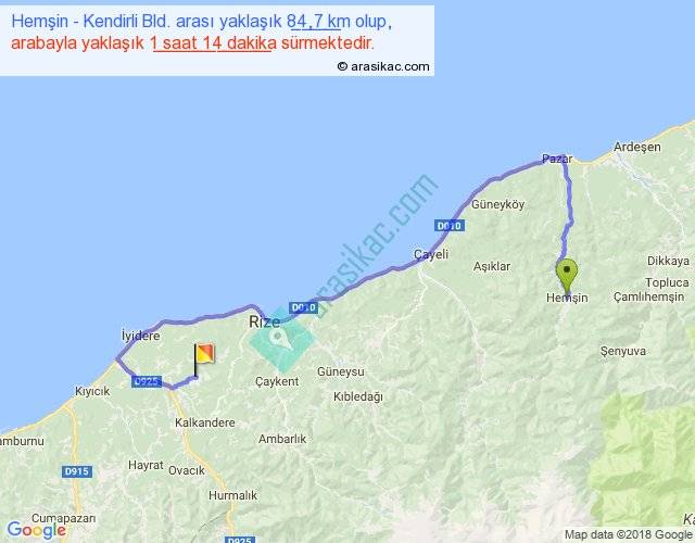 Hemşin - Kendirli Bld. arası yaklaşık olarak 90 km/h ile yukarıda belirtilen sürede olup, iki yerin kuş uçuşu uzaklığı (mesafesi) 40'dir. Yolculuk otobüsle 1 saat 36 dakika sürmektedir.