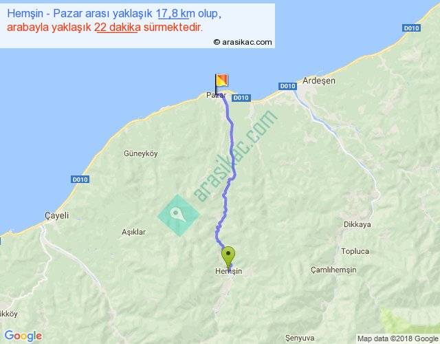 Hemşin - Pazar arası yaklaşık olarak 90 km/h ile yukarıda belirtilen sürede olup, iki yerin kuş uçuşu uzaklığı (mesafesi) 15'dir. Yolculuk otobüsle 28 dakika sürmektedir.