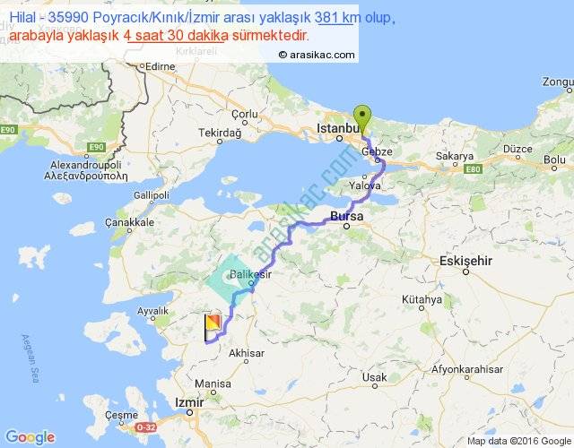 Hilal - 35990 Poyracık Kınık İzmir arası yaklaşık olarak 90 km/h ile yukarıda belirtilen sürede olup, iki yerin kuş uçuşu uzaklığı (mesafesi) 267'dir. Eğer belirtilen yerler arasında uçak seferi var ise bu süre uçakla 24 dakika'ya kadar düşebilir. Yolculuk otobüsle 5 saat 51 dakika sürmektedir.