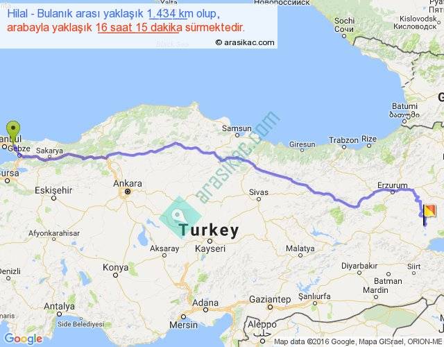 Hilal - Bulanık arası yaklaşık olarak 90 km/h ile yukarıda belirtilen sürede olup, iki yerin kuş uçuşu uzaklığı (mesafesi) 1120'dir. Eğer belirtilen yerler arasında uçak seferi var ise bu süre uçakla 1 saat 43 dakika'ya kadar düşebilir. Yolculuk otobüsle 21 saat 7 dakika sürmektedir.