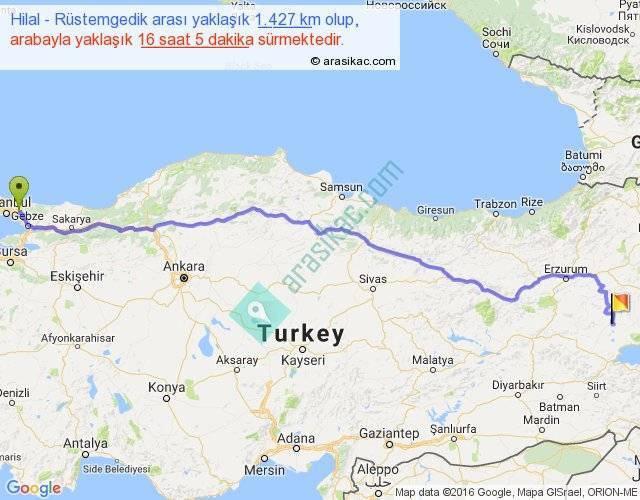 Hilal - Rüstemgedik arası yaklaşık olarak 90 km/h ile yukarıda belirtilen sürede olup, iki yerin kuş uçuşu uzaklığı (mesafesi) 1122'dir. Eğer belirtilen yerler arasında uçak seferi var ise bu süre uçakla 1 saat 43 dakika'ya kadar düşebilir. Yolculuk otobüsle 20 saat 54 dakika sürmektedir.