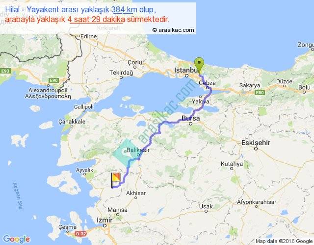 Hilal - Yayakent arası yaklaşık olarak 90 km/h ile yukarıda belirtilen sürede olup, iki yerin kuş uçuşu uzaklığı (mesafesi) 270'dir. Eğer belirtilen yerler arasında uçak seferi var ise bu süre uçakla 24 dakika'ya kadar düşebilir. Yolculuk otobüsle 5 saat 49 dakika sürmektedir.