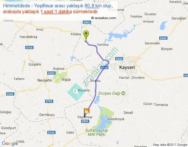 Himmetdede - Yeşilhisar arası yaklaşık olarak 90 km/h ile yukarıda belirtilen sürede olup, iki yerin kuş uçuşu uzaklığı (mesafesi) 62'dir. Yolculuk otobüsle 1 saat 19 dakika sürmektedir.