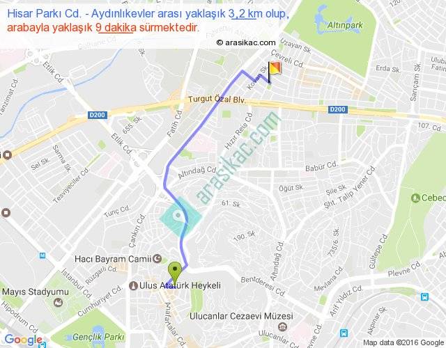 Hisar Parkı Cd. - Aydınlıkevler arası yaklaşık olarak 90 km/h ile yukarıda belirtilen sürede olup, iki yerin kuş uçuşu uzaklığı (mesafesi) 2'dir. Yolculuk otobüsle 11 dakika sürmektedir.