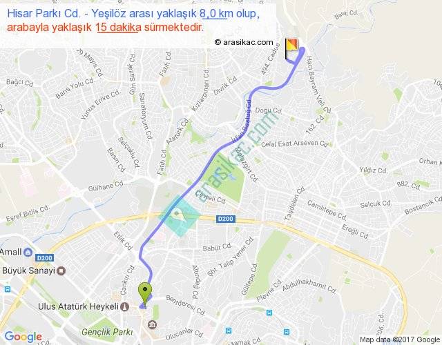 Eğer Hisar Parkı Cd. Yeşilöz arası ne kadar yakar (benzin/mazot) diyorsanız, kilometrede 3 ₺ yakan bir aracınız var ise 24, km'de 4 ₺ yakan bir aracınız var ise 32, km'de 5 ₺ yakan bir aracınız var ise 40 ile bu yolculuğu tamamlayabilirsiniz.