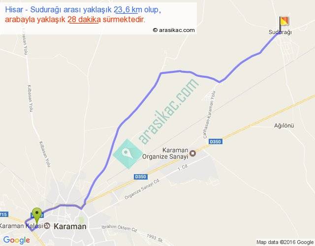 Hisar - Sudurağı arası yaklaşık olarak 90 km/h ile yukarıda belirtilen sürede olup, iki yerin kuş uçuşu uzaklığı (mesafesi) 19'dir. Yolculuk otobüsle 36 dakika sürmektedir.