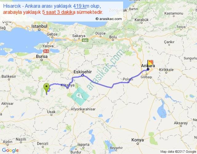 Hisarcık - Ankara arası yaklaşık olarak 90 km/h ile yukarıda belirtilen sürede olup, iki yerin kuş uçuşu uzaklığı (mesafesi) 318'dir. Eğer belirtilen yerler arasında uçak seferi var ise bu süre uçakla 29 dakika'ya kadar düşebilir. Yolculuk otobüsle 6 saat 33 dakika sürmektedir.