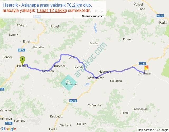 Hisarcık - Aslanapa arası yaklaşık olarak 90 km/h ile yukarıda belirtilen sürede olup, iki yerin kuş uçuşu uzaklığı (mesafesi) 54'dir. Yolculuk otobüsle 1 saat 33 dakika sürmektedir.