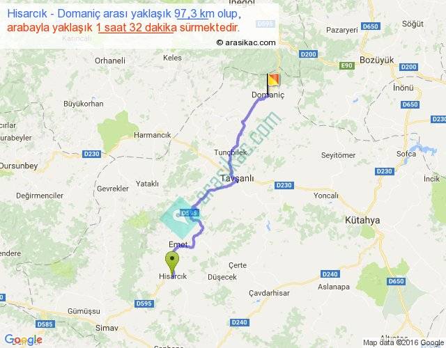 Hisarcık - Domaniç arası yaklaşık olarak 90 km/h ile yukarıda belirtilen sürede olup, iki yerin kuş uçuşu uzaklığı (mesafesi) 69'dir. Yolculuk otobüsle 1 saat 59 dakika sürmektedir.