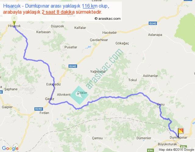 Hisarcık - Dumlupınar arası yaklaşık olarak 90 km/h ile yukarıda belirtilen sürede olup, iki yerin kuş uçuşu uzaklığı (mesafesi) 77'dir. Yolculuk otobüsle 2 saat 46 dakika sürmektedir.