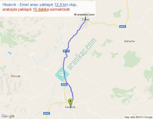 Hisarcık - Emet arası yaklaşık olarak 90 km/h ile yukarıda belirtilen sürede olup, iki yerin kuş uçuşu uzaklığı (mesafesi) 11'dir. Yolculuk otobüsle 19 dakika sürmektedir.