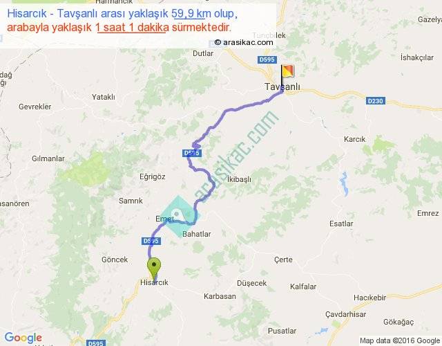 Hisarcık - Tavşanlı arası yaklaşık olarak 90 km/h ile yukarıda belirtilen sürede olup, iki yerin kuş uçuşu uzaklığı (mesafesi) 40'dir. Yolculuk otobüsle 1 saat 19 dakika sürmektedir.